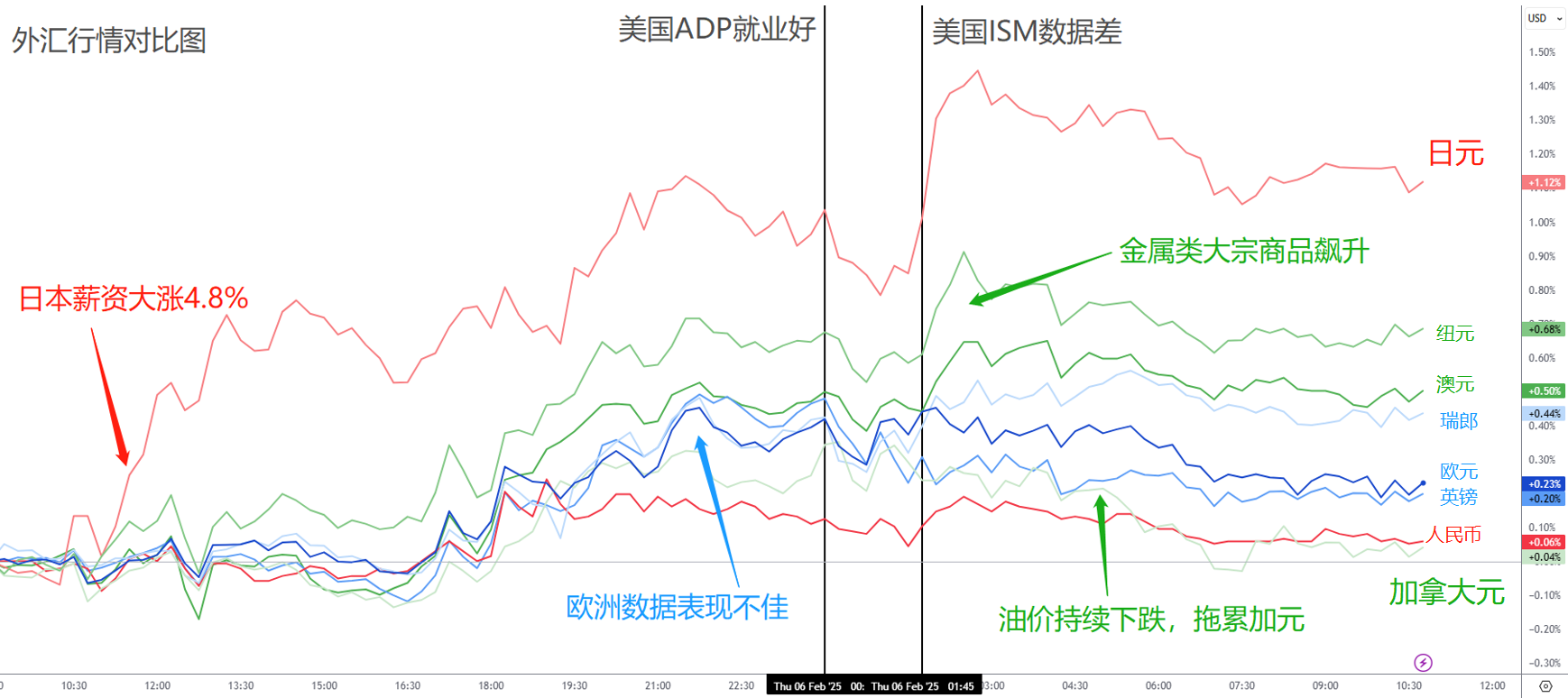 日元:美债利率下跌,美日利差缩小,对日元自然有利。而且早间,日本发布了12月劳工收入数据,同比大涨4.8%,远超预期的3.7%。这体现了日本的工资通胀螺旋上涨可能已经成型,意味着日本继续加息的可能性大大增加。日元随之大涨,全天表现强势。
