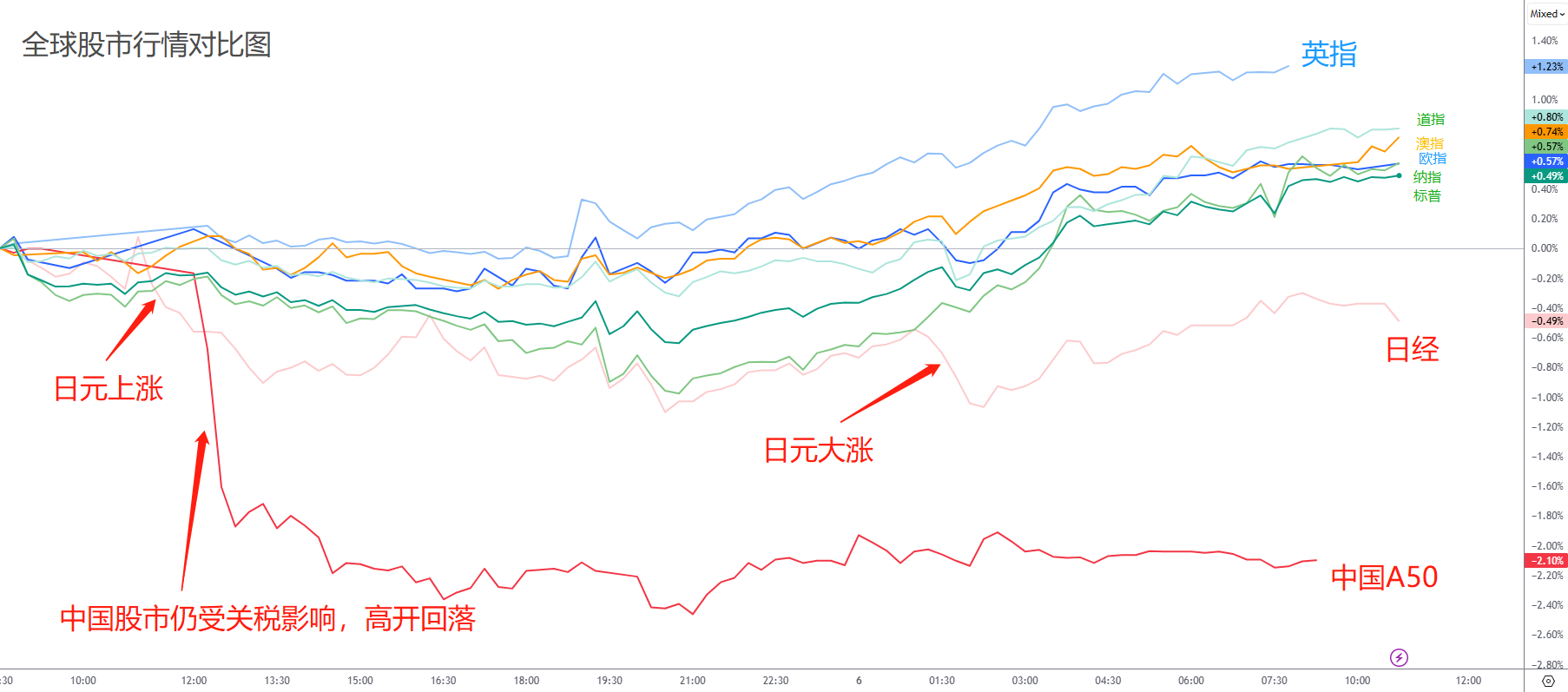 美元下跌带动全球股市上涨,除了加大贸易战的中国股市早盘高开低走。