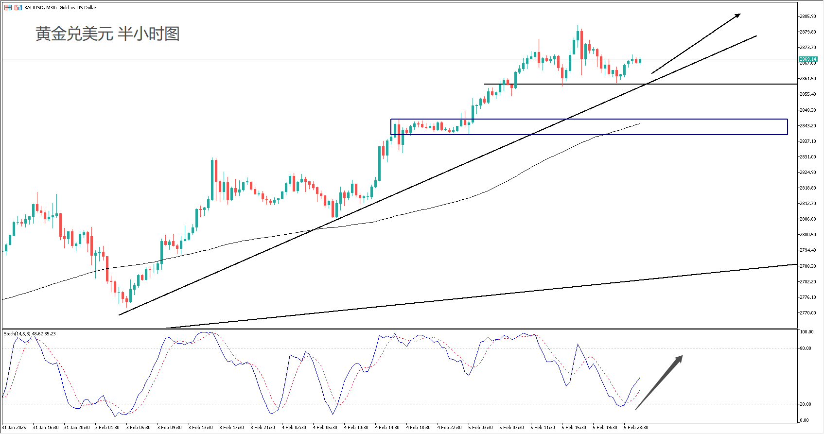 交易策略:(趋势跟随)沿着趋势线波段看涨,2860是一个分水岭