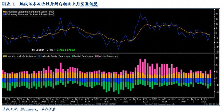 本次会议声明对就业和通胀的看法,相比于9月份没有变化,但对经济的看法边际改善。这一点与近期情况对应:经济增速或明显反弹(GDP now模型预计Q3环比折年率3.9%,蓝筹经济学调查预期为2.5%,彭博一致预期为2.7%),鲍威尔表示,联储内部也普遍上调了对今明两年的经济增长预测。对于就业,依然是“就业增长已经放缓(Job gains have slowed),失业率有所上升但仍处低位(has edged up but remains low)”、“近几个月就业下行风险已经上升(that downside risks to employment rose in recent months)”的表述。对通胀的表述依然是“有所上升并依然较高(moved up and remains somewhat elevated)”。但对经济增长的表述边际改善,从“今年上半年经济活动增长放缓(moderated in the first half of the year)”修改为“经济活动一直在以温和的速度扩张(has been expanding at a moderate pace)”。