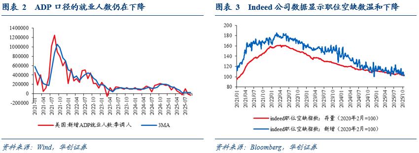 从就业来看,9月份劳动力市场依然在持续渐进地降温。由于美国政府关门,9月非农就业报告并未公布。从三方数据来看,就业状况延续疲软但并未加速恶化。ADP 估计,私人就业人数继8月份减少3000人后,9月份再度减少32000人。该公司表示,“大多数行业的就业创造继续失去动力“。在线求职公司Indeed 的招聘信息数据显示,就业人数持续逐渐减少,但招聘人数并未大幅下滑。