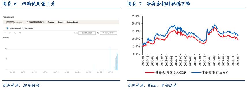 4)准备金相对规模也下降至联储测算的区间。储备金余额占美国名义GDP的比例约9%,储备金余额占银行总资产的比例约12%,这一水平已达到纽约联储曾估算的合意区间,即占名义GDP比例约8-10%,占总资产比例约12-13%。