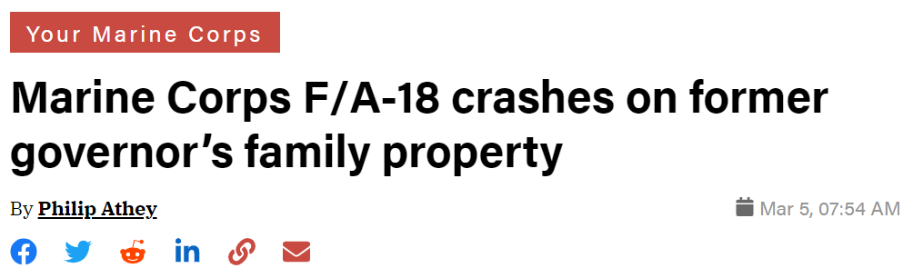 美国海军陆战队时报报道,事故发生在上周四下午3点,1架陆战队533战斗攻击中队的F/A-18D正在执行例行飞行任务,突然发生引擎故障起火,飞行员先试图关闭单具引擎,但是火并没有熄灭,他决定将战机在空旷处上空再跳伞,而他所择择的空旷地点,刚好是前州长桑福德的家族农场。前州长随后得知此事,他表示战机坠毁地点确实是他家的土地,位于父亲墓地不远处。