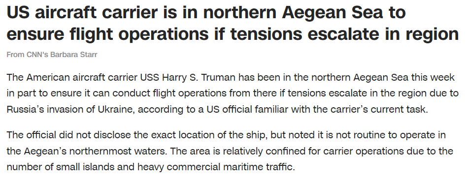 据美国有线电视新闻网(CNN)在3月5日报道,美国官员称,美军“杜鲁门”号航母与“圣哈辛托”号巡洋舰本周一直部署在爱琴海北部。部分原因是为了确保土耳其海峡及周边地区的安全。土耳其海峡是连接黑海与地中海的唯一通道。此前,乌克兰曾要求关闭土耳其海峡,禁止俄军舰通过。