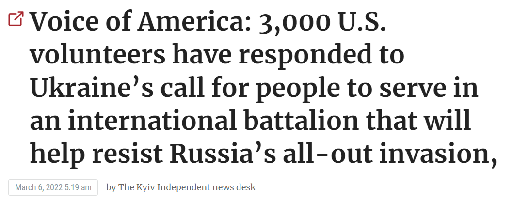 俄乌冲突持续进入第12日,乌克兰总统泽连斯基日前宣布将组“国际志愿军”兵团抵抗俄军,引起许多有志之士的兴趣,虽然美军到现在仍未有所动静,不过乌克兰驻华盛顿大使馆的官员透露,至少有3000位美国人提出加入外籍兵团的申请。