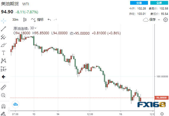 WTI原油一度下跌超8%,至93.54美元/桶低点,周一下跌5.78%。布伦特原油价格线下跌7.7%,交投于98.70美元/桶一线,周一的跌幅为5.12%。在过去一周的动荡交易中,油价下跌了20%以上,其间出现了剧烈的、历史性的波动。
