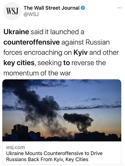 《华尔街日报》 报道称,乌克兰方面说,该国军队在首都基辅和其他主要城市发动了反攻。与此同时,乌克兰总统泽连斯基敦促美国国会向俄罗斯提供更多武器,并加大对俄罗斯的经济压力。