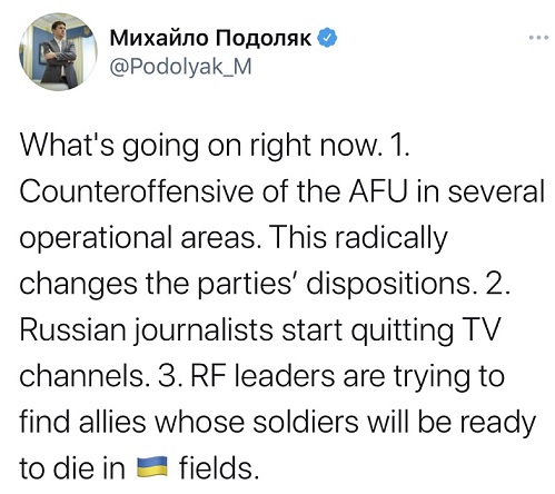 泽连斯基顾问、乌克兰谈判代表Mykhailo Podolyak周三表示,乌克兰武装部队将在几个作战地区,对俄罗斯军队进行反攻,这从根本上改变双方的战略部署。