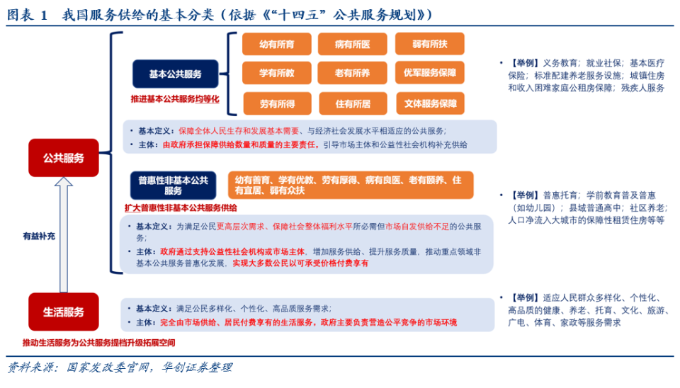 基本公共服务,覆盖了“贯穿一生”的9大领域,“幼有所育、学有所教、劳有所得、病有所医、老有所养、住有所居、弱有所扶、优军服务有保障、文体服务有保障”。普惠性非基本公共服务更进一步,“幼有善育、学有优教、劳有厚得、病有良医、老有颐养、住有宜居、弱有众扶”。生活服务则包括了“多样化、个性化、高品质的健康、养老、托育、文化、旅游、广电、体育、家政等服务需求”。