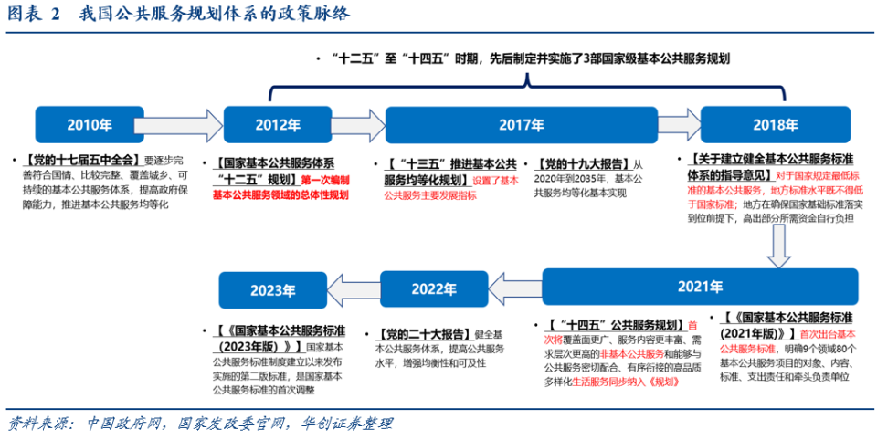 。,(依据2012年7月,国新办就《国家基本公共服务体系“十二五”规划》有关情况举行发布会)。,国务院印发《“十三五”推进基本公共服务均等化规划》,此次五年规划设置了8大领域、20个指标到2020年的具体目标。国家发改委等经国务院批复同意,印发《“十四五”公共服务规划》。据国家发改委就《“十四五”公共服务规划》答记者问,该文件是作为“‘十四五’时期乃至更长一段时期促进公共服务发展的综合性、基础性、指导性文件”。此次规划的变化包括:“首次将覆盖面更广、服务内容更丰富、需求层次更高的非基本公共服务和能够与公共服务密切配合、有序衔接的高品质多样化生活服务同步纳入《规划》”;进一步将20余个具体目标,区分为预期性指标、约束性指标(章节三将对20余个指标进一步拆分)。