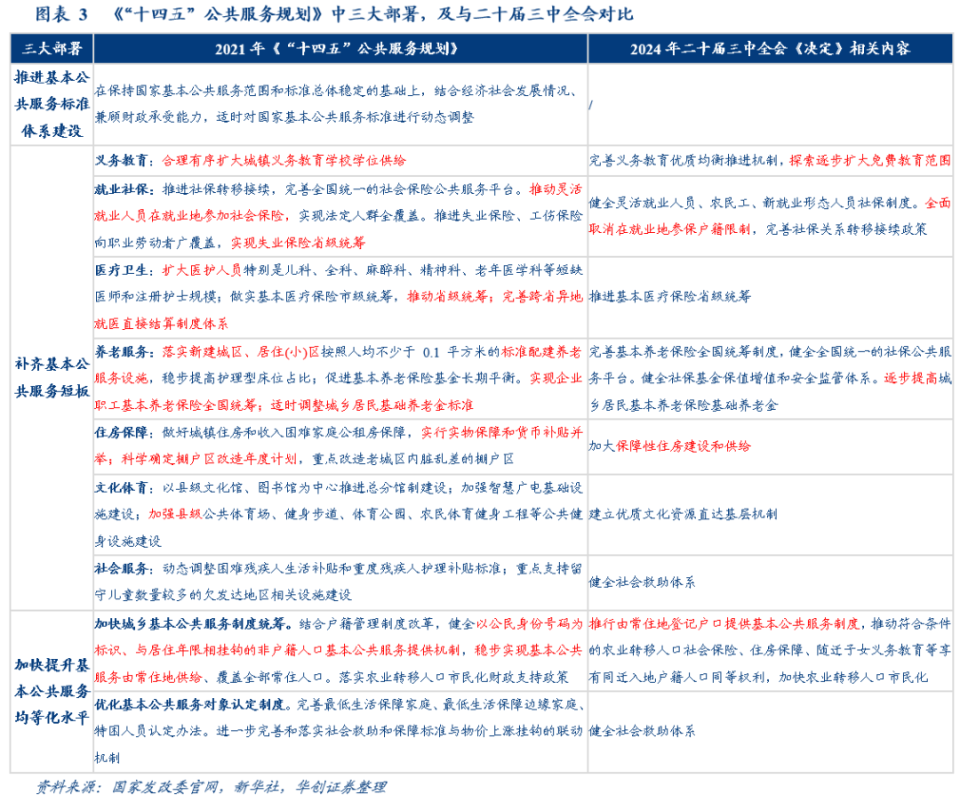 在第三章“推进基本公共服务均等化”中,重点做出三方面部署,部分内容在今年二十届三中全会中有进一步部署(见图3)。