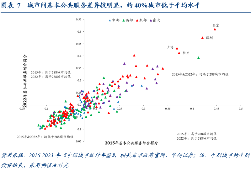 综合得分均值呈现:东北34城市>东部87城市>288个城市整体>西部87城>中部80城市;东部87个城市中,2022年高于均值水平、低于均值水平的城市各占一半。