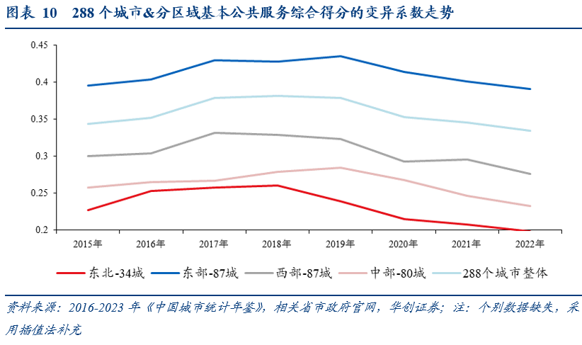 计算288个城市基本公共服务综合得分的变异系数,以反映地区间的均衡程度,变异系数越小,对应均衡程度较高。