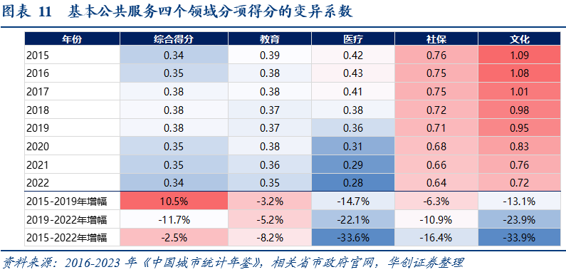 2015-2022年,教育、文化、社保、医疗的均衡程度,均有不同程度提升;,2022年,社保、文化两大领域,变异系数相对较高。