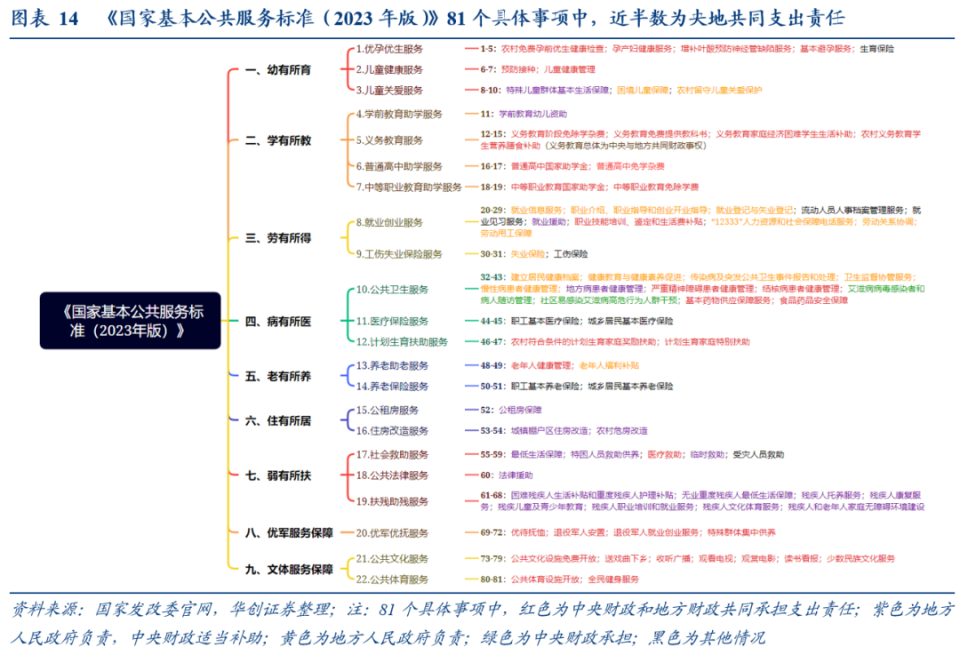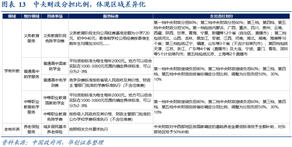 《国家标准2023》规定的81个事项中,近半数(37项,见图14红色)为“中央财政和地方财政共同承担支出责任”。部分事项中,文件明确中央财政对欠发达地区承担更高支出比例。以教育为例,《国家标准2023》的支出责任划分,是参考《教育领域中央与地方财政事权和支出责任划分改革方案》。该方案实行分档补助,内蒙古、广西等12个西部省份为第一档,中央财政承担80%;其他24个省、直辖市和计划单列市又分为二至五档,中央财政承担比例相对较低。