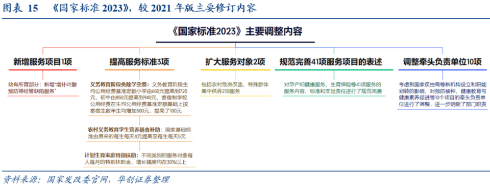 《国家标准2023》包含了章节一中提到的9大领域,并将其进一步细分为22个细分模块、81个具体事项,每个事项均明确了服务对象、内容、标准、支出责任划分等等。如在学有所教-普通高中助学服务-普通高中国家助学金中,明确对家庭困难的普通高中生,“平均资助标准为每生每年2000元”。如在学有所教-义务教育服务-义务教育阶段免除学杂费中,“义务教育阶段生均公用经费基准定额为小学720元,初中940元”。