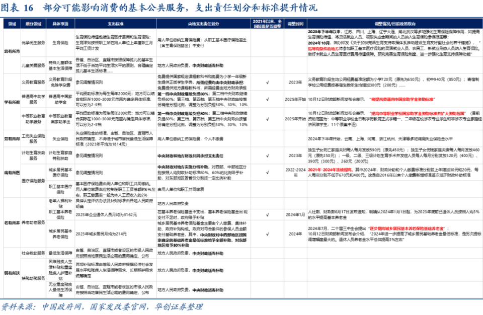 《国家标准2023》在2021年基础上,进一步提高了“义务教育阶段免除学杂费”“农村义务教育学生营养膳食补助”的补助水平。②,持续提高城乡居民医疗保险财政补助和缴费标准,2024年,实现自2016年以来个人缴费新增标准首次低于财政补助标准。2014年以来,6次提高城乡居民基本养老保险基础养老金。其中2024年城乡居民基础养老金月最低标准提高20元,增长了19.4%。