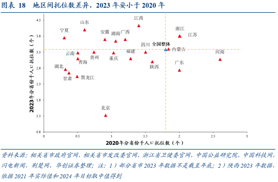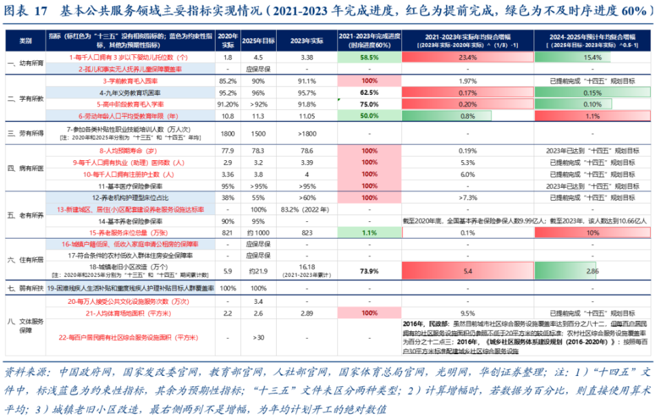 今明两年仍将维持较高增速的,涉及托育、养老两大领域。按照设定目标和2023年实际情况,今明两年:①每千人口拥有 3 岁以下婴幼儿托位数,年均增速预期为15.4%,“十四五”前三年年均23.4%;②养老服务床位总量,年均增速预期为10%,“十四五”前三年进度偏慢。部分“新”设置的、且可能仍未达标的,如养老领域的新建城区、居住(小)区配套建设养老服务设施达标率。“新”设置的、且标准有提升的,如文体领域的每百户居民拥有社区综合服务设施面积。