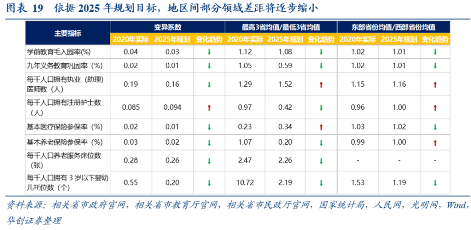 以教育、医疗、养老、托育的部分指标为例,地区间2025年规划目标的变异系数,整体来看小于2020年实际数据的变异系数。原因在于,中西部省份2020年数据较低,参考国家规划目标后,“十四五”期间规划提升幅度更大。以每千人口拥有 3 岁以下婴幼儿托位数这一指标为例:2020年,东部6省平均约1.5个,中西部省15平均为1.05个;“十四五”期间,东部6省预期年均复合增速为29%,中西部15省则达到37%。