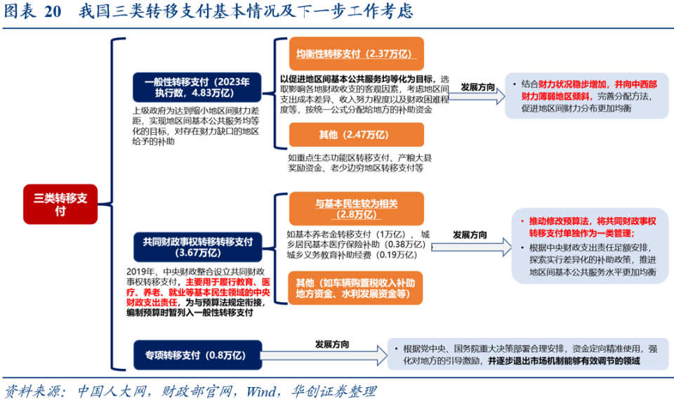 “主要用于均衡地区间财力配置,保障地方政府日常运转和推动区域协调发展”,2023年执行数为8.5万亿,除去共同财政事权转移支付外为4.8万亿,其中近一半是均衡性转移支付(“为缩小地区间财力差距、逐步实现基本服务均等化”设立)。