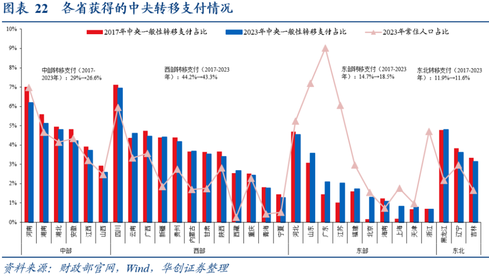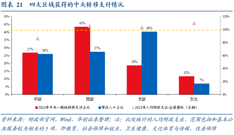 (包括共同财政事权转移支付):2023年,西部地区以27%的人口份额,获得43%的转移支付份额;与之对应的是东部地区,以40%的人口份额,获得19%的转移支付份额。