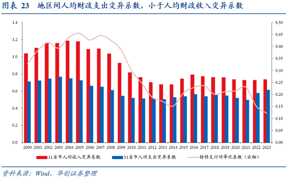 :参考刘勇政《完善政府间转移支付制度》:计算地区人均财政收入和人均财政支出变异系数,用其差额部分反映转移支付的均等化效果(转移支付均等化系数)。2000年以来,在中央转移支付的调剂下,地区间人均财政支出变异系数,要始终小于人均财政收入变异系数。