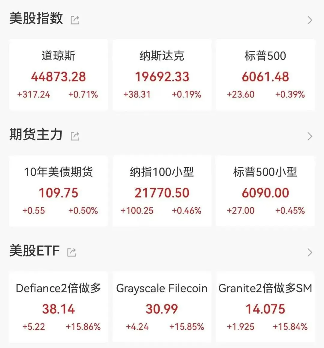道琼斯工业平均指数上涨317.24点(0.71%)至44,873.28点,美国标准普尔500指数上涨0.39%至6,061.48点,纳斯达克综合指数微升0.19%,收于19,692.33点。