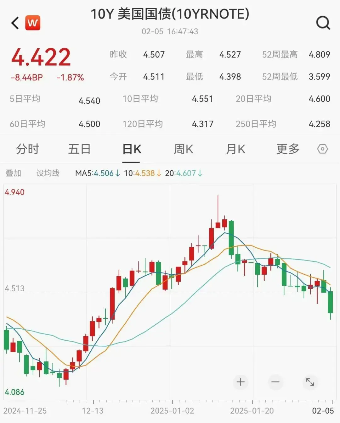 收益率下降至4.422%,下跌了8bp,表明债券市场受到避险资金流入的影响。这种情况通常意味着市场对经济前景持谨慎态度,投资者倾向于购买美国国债来规避风险。
