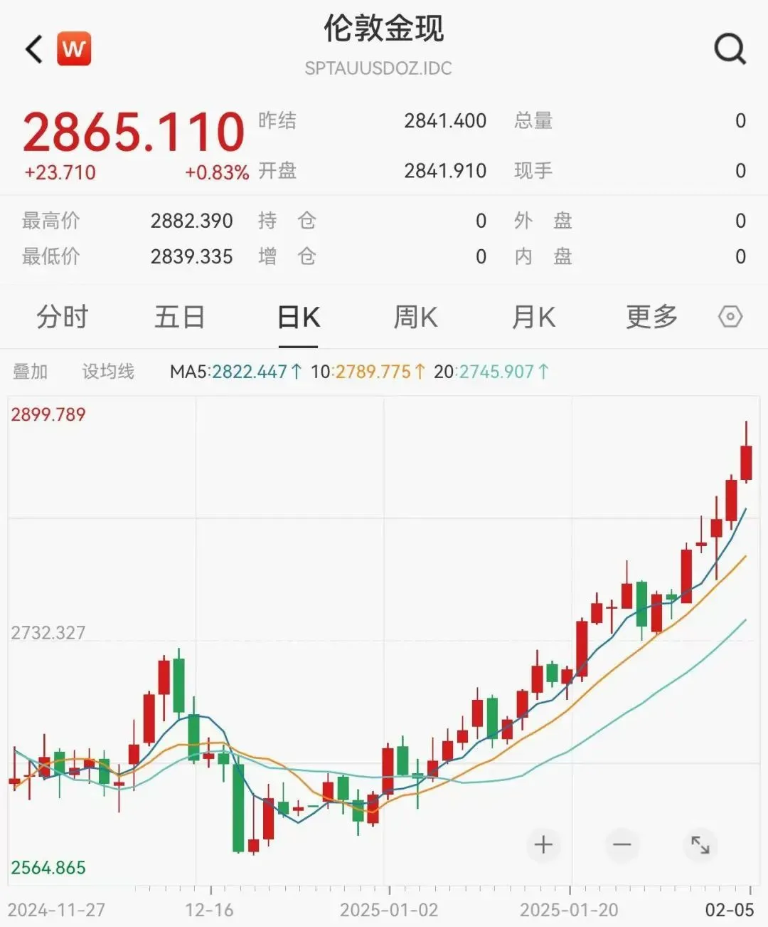 黄金价格上涨至2865.110,涨幅为0.83%。黄金作为避险资产,在市场不确定性增加时通常会上涨,反映了投资者对市场波动和风险的担忧。