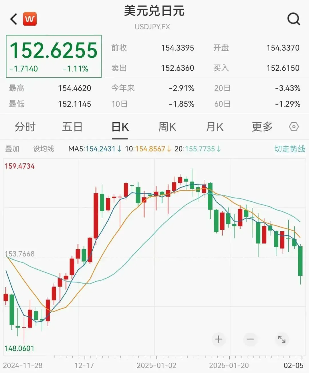 日元兑美元上涨至152.6255,升值了1.11%。日元通常被视为避险货币,当全球市场出现不确定性时,投资者通常会买入日元,这导致日元汇率上升。