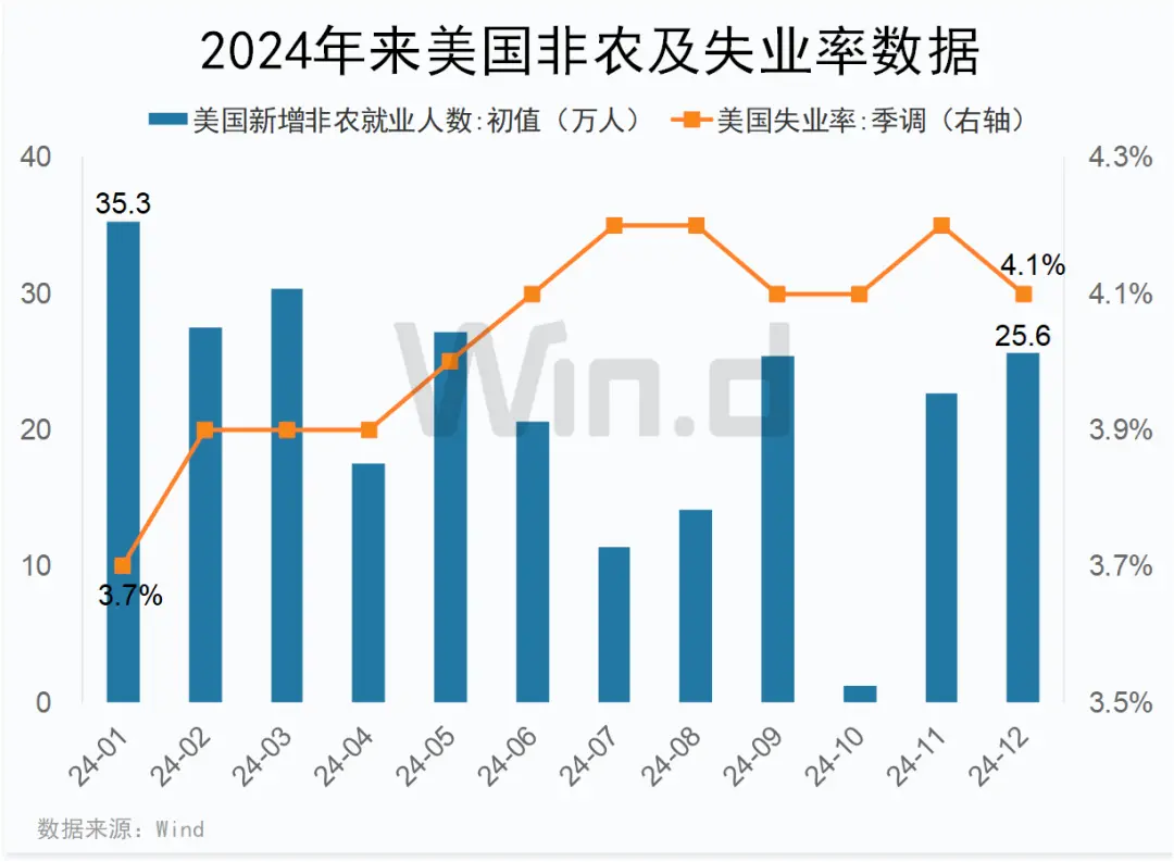 整体来看,美国劳动力市场正逐步从飓风和大规模罢工中复苏,非农就业人数连续走高。2024年12月美国非农数据大超预期,新增就业人口达25.6万人,同时失业率降至4.1%,显示出美国就业市场保持韧性。