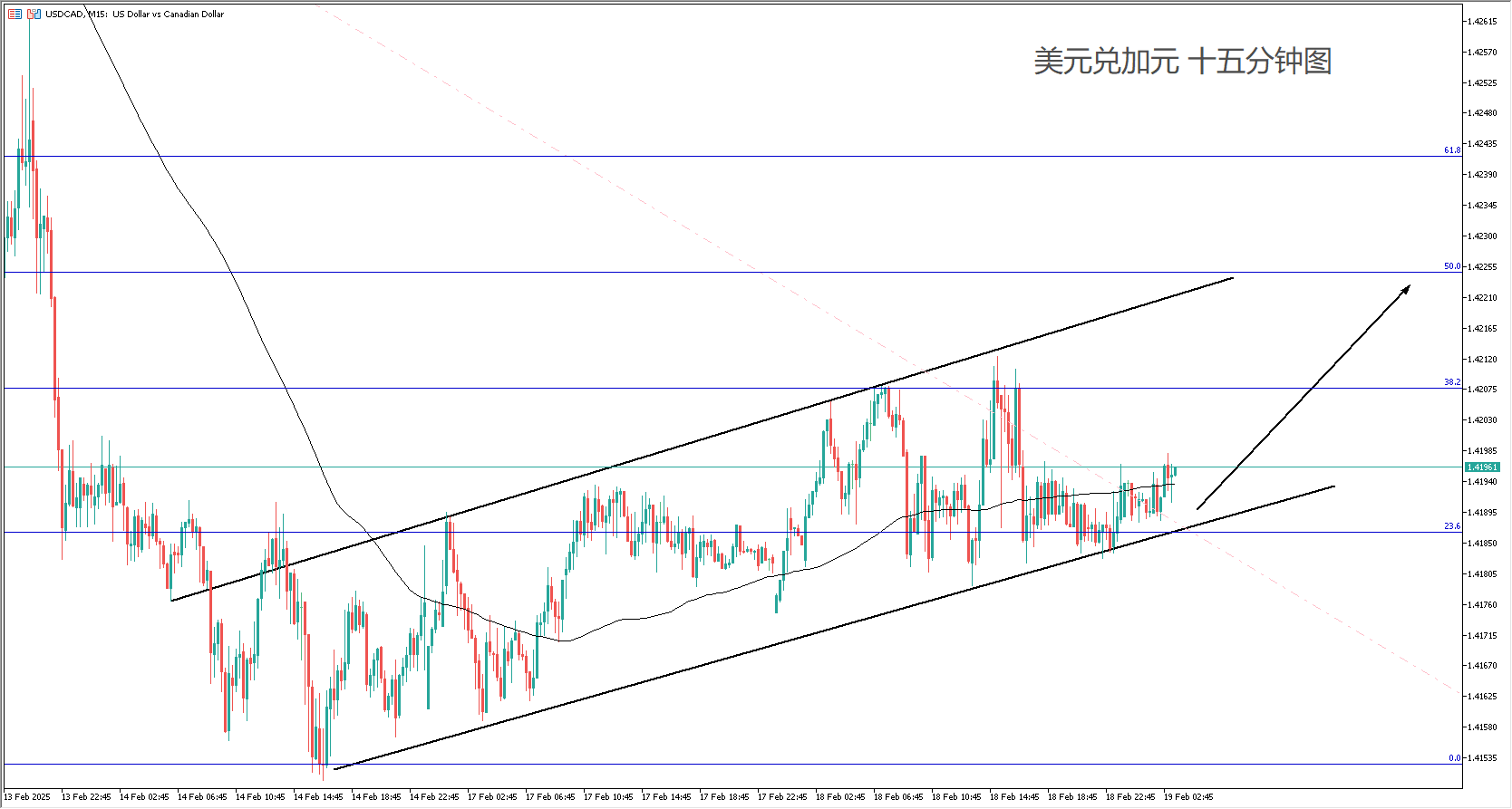 技术面:100均线转头微微向上,美加沿着通道结构上涨。交易策略以沿着通道下沿跟随看涨为主,目标位置关注斐波那契回调线位置。